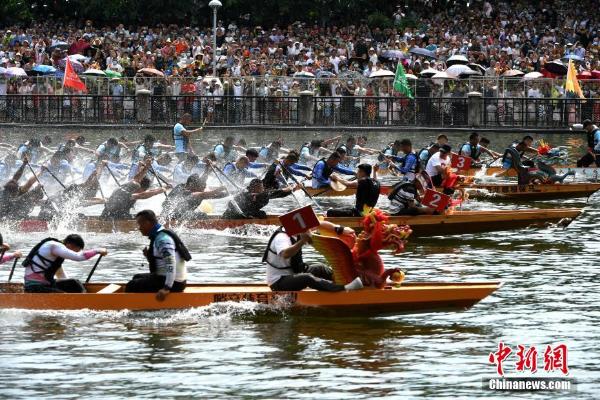 6月14日,中国传统端午节,2021年福州市传统龙舟邀请赛在福州海峡会展中心浦下河龙舟池举行。20支龙舟队参与角逐,吸引许多人前来观看。王东明 摄