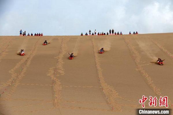 6月13日,敦煌鸣沙山月牙泉景区举办滑沙比赛。 张晓亮 摄