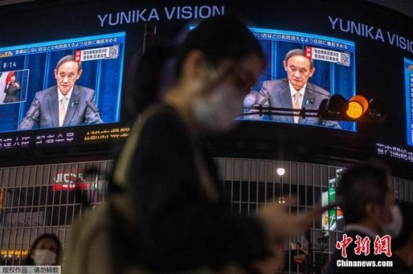 资料图:日本东京街头播出首相菅义伟发布紧急事态宣言的画面。