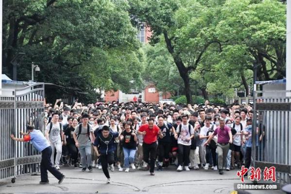6月9日,考生与老师一同冲出长沙市一中考点。当日,湖南省考生结束2021年全国高考。中新社记者 杨华峰 摄