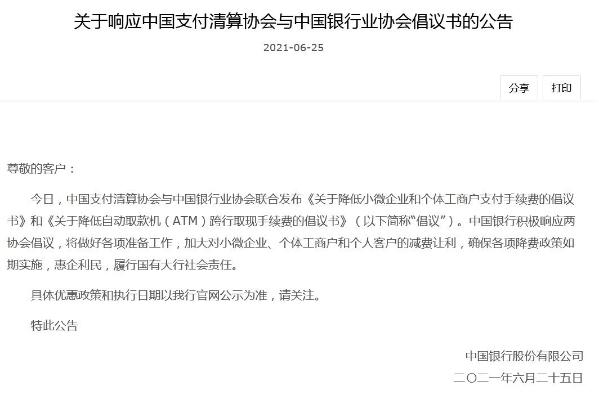 中国银行公告表示,积极响应两协会倡议,将做好各项准备工作,加大对小微企业、个体工商户和个人客户的减费让利,确保各项降费政策如期实施,惠企利民,履行国有大行社会责任。具体优惠政策和执行日期以我行官网公示为准。