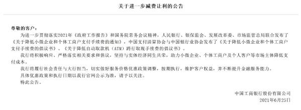 工行公告称,将积极响应、严格落实相关要求和倡议,坚持与实体经济同生共荣,助力小微企业、个体工商户及个人客户等市场主体降低支付成本。具体优惠政策和执行日期以我行官网公示为准。