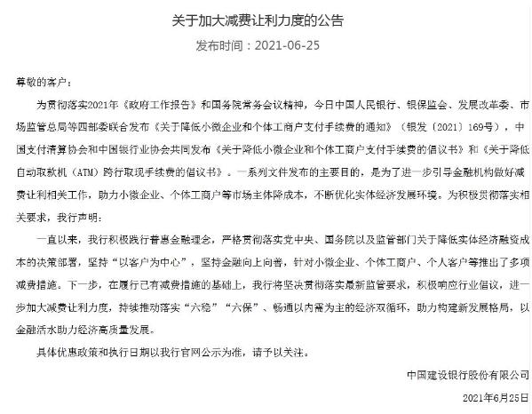 建行公告表示,在履行已有减费措施的基础上,将坚决贯彻落实最新监管要求,积极响应行业倡议,进一步加大减费让利力度,持续推动落实“六稳”“六保”、畅通以内需为主的经济双循环,助力构建新发展格局,以金融活水助力经济高质量发展。具体优惠政策和执行日期以我行官网公示为准。