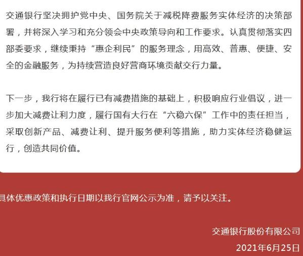 交行发布公告称,认真贯彻落实四部委要求,继续秉持“惠企利民”的服务理念,用高效、普惠、便捷、安全的金融服务,为持续营造良好营商环境贡献交行力量。