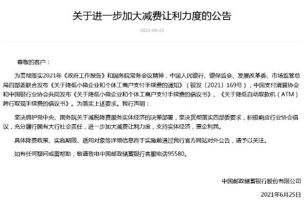邮储银行声明称,坚决拥护党中央、国务院关于减税降费服务实体经济的决策部署,坚决贯彻落实四部委要求,积极响应行业协会倡议,充分履行国有大行社会责任,进一步加大减费让利力度,支持实体经济,惠企利民。