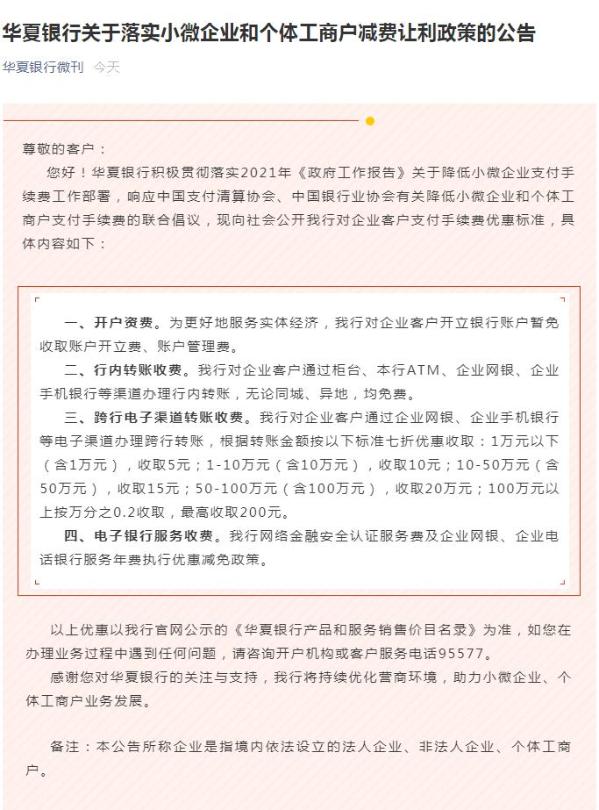 中信银行发布的《关于进一步落实减费让利倡议书的声明》称,中信银行对小微企业和个体工商户跨行转账汇款等支付手续费实施优惠减免,帮助企业降低成本,全力支持实体经济发展。