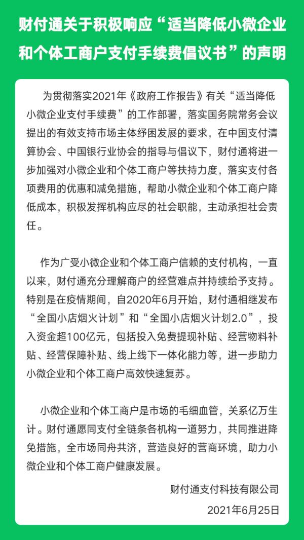 腾讯集团旗下第三方支付平台财付通发公告表示,财付通将进一步加强对小微企业和个体工商户等扶持力度,落实支付各项费用的优惠和减免措施,帮助小微企业和个体工商户降低成本,积极发挥机构应尽的社会职能,主动承担社会责任。