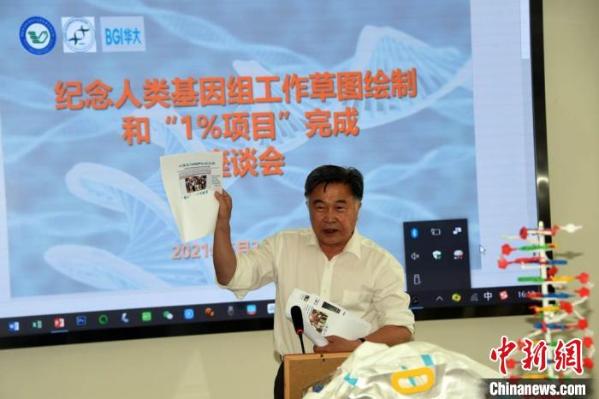 座谈会上,杨焕明院士介绍中国当年参与完成人类基因组计划“1%项目”相关情况。 中新社记者 孙自法 摄