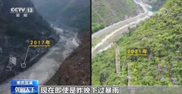 总台记者 王磊: 四年以后,我再次回到宁厂古镇,发现这里的变化让人震撼。记得当年我就是爬上身后这座石头山见证了林云喜他们种树的艰辛,功夫不负有心人,现在我们可以看到山体上上包裹上了一层毛茸茸的绿色。在山脚下就是长江的一级支流大宁河,记得以前有很多泥沙,现在即使是昨天刚下过暴雨,河水仍然是很清澈的。
