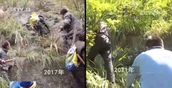 总台记者 王磊: 当时爬上来的时候特别害怕,因为下面是悬崖。确实是植物比以前多了很多,我看这些植物都可以用手扶着,确实比上次轻松了很多。