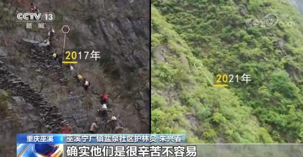 这是2017年记者在重庆巫溪宁厂古镇记录下的场景,为了在这片已经荒漠化的石头山上种树,官山林场工班长林云喜和工友们肩背手提,先是把水泥、石块、泥土运上峭壁筑成一个个石窝子,再把树苗一棵棵背上山,种在石窝子里。