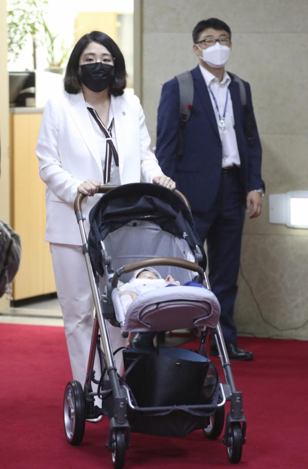 海外网7月5日电 据韩联社报道,7月5日,韩国“基本收入党”国会议员龙慧仁用婴儿车推着出生59天的儿子,来到首尔国会办公大楼,这是她5月生产后首次上班。