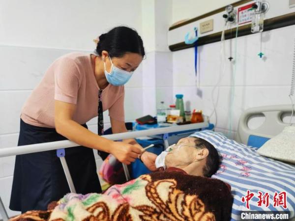 中新网宜昌7月6日电 (乔长姣 董晓斌)“公公这些年挺遭罪的,我只想多照顾他,尽量减轻他的痛苦。”5日,在湖北省兴山县中医医院,刘传福为患病的公公擦拭脸颊。19年来,公婆和丈夫先后患重病,刘传福用柔弱的肩膀撑起了这个家。