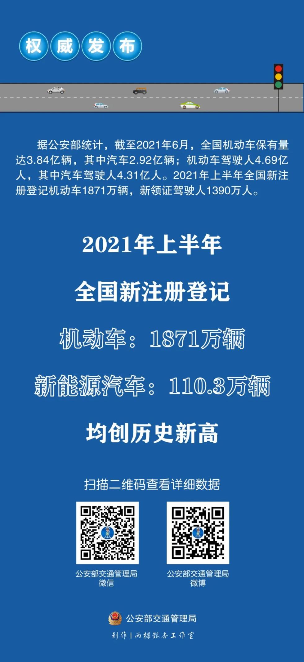 公安局交通管理局微信公众号消息:据公安部统计,截至2021年6月,全国机动车保有量达3.84亿辆,其中汽车2.92亿辆;机动车驾驶人4.69亿人,其中汽车驾驶人4.31亿人。2021年上半年全国新注册登记机动车1871万辆,新领证驾驶人1390万人。
