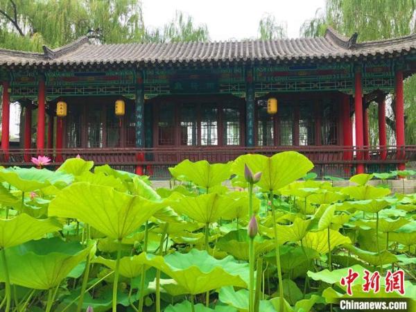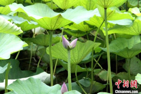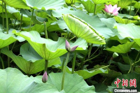 “藕花深处田田叶,叶上初生并蒂莲。”近日,在山东济南大明湖畔南丰祠雨荷厅前的荷花池里出现一株并蒂莲,目前还处于生长期,距开花大约还需要一周的时间。