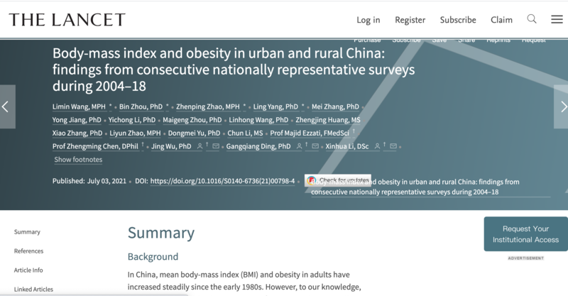 中国青年报客户端讯(中青报·中青网记者 刘昶荣)7月1日,中国疾病预防控制中心慢性非传染性疾病预防控制中心及其合作者(中国疾控中心营养与健康所、英国帝国理工学院、牛津大学等)在《柳叶刀》(The Lancet)发表了论文——《中国城乡平均体重指数和肥胖:2004至2018年全国代表性调查结果》,该研究利用2004至2018年间,中国31个省(区、市)开展的6次具有全国代表性的慢性病及危险因素监测获取的累计约65万名18-69岁成年人的身高和体重,分析了人群BMI(身体质量指数)、超重和肥胖率,并比较其随性别、年龄、城乡分布、地理区域和社会经济状况的变化趋势。