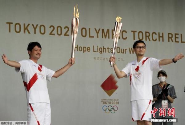 当地时间7月9日,东京奥运会圣火抵达日本东京都,圣火迎接仪式在驹泽奥林匹克公园体育场举行。图为火炬手们展示奥运圣火。