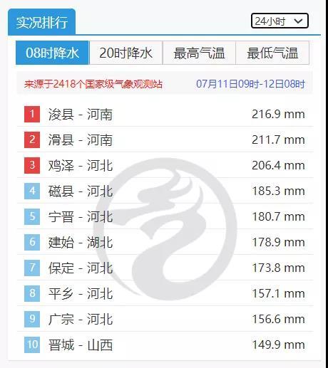 11日06时至12日06时,安阳、鹤壁、济源局地出现特大暴雨,濮阳、新乡、焦作局地出现大暴雨,三门峡、洛阳、郑州、南阳局地出现暴雨,有439个雨量站降水量超过50毫米 ,其中大于100毫米的有200个,大于250毫米的有6个。最大降水量出现在济源水洪池322.3毫米 。