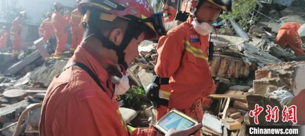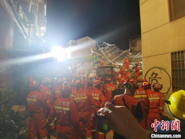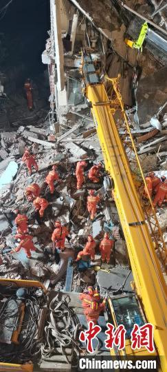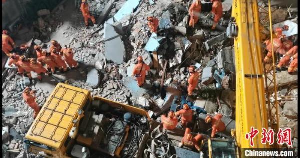中新网记者第一时间赶到事发现场,消防官兵、民警、社区工作人员正在现场参加救援。坍塌房屋受损情况严重,大型设备正在对倒塌房屋进行破拆。起重机在举吊构件时,不时有残渣掉落。救援人员带着多只搜救犬进入了现场。记者看到,消防官兵用担架将多位伤者抬出事故现场。