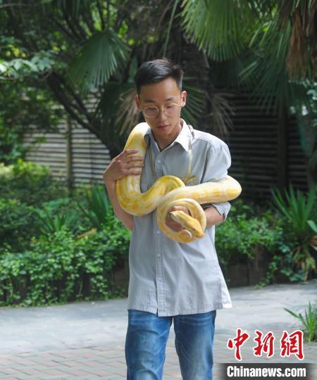 饲养员展示黄金蟒。 陈怡婷 摄