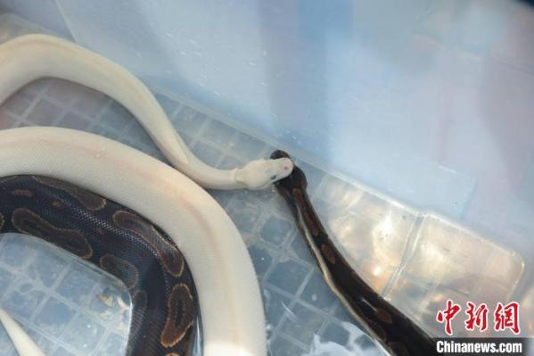 白球蟒和原色球蟒一起泡药浴。 陈怡婷 摄