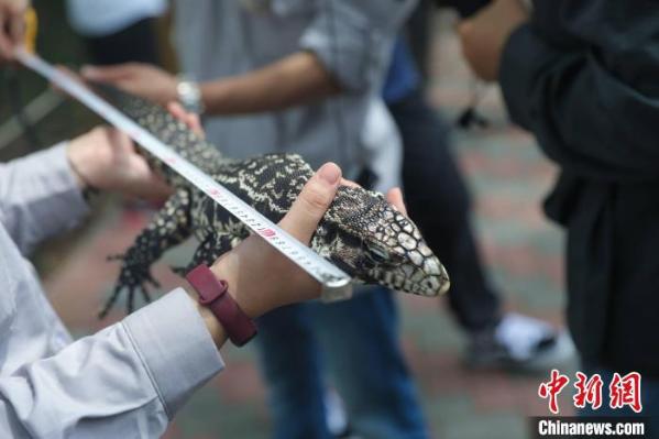 饲养员为两栖类爬行动物体检。 陈怡婷 摄