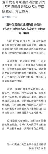 中新网台州7月16日电 (记者 范宇斌)浙江省台州市温岭市突发公共卫生事件应急指挥部16日发布通报称,16日上午,温岭市疾控中心接到南京通报病例协查信息,通报确诊病例的1名密切接触者和多名次密切接触者(密接的密切接触者)居住温岭市。