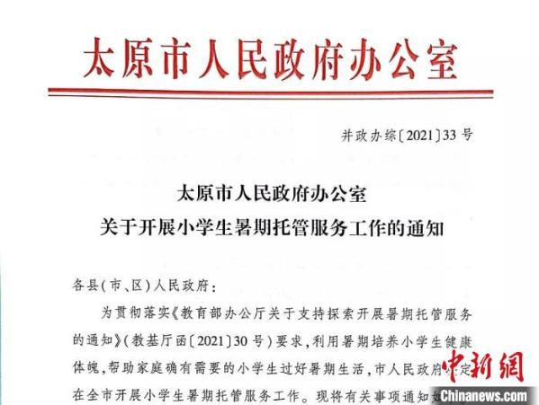 太原市今年暑期启动小学生暑期托管服务工作。 太原市人民政府办公室文件截图