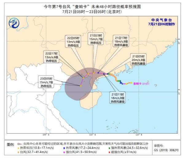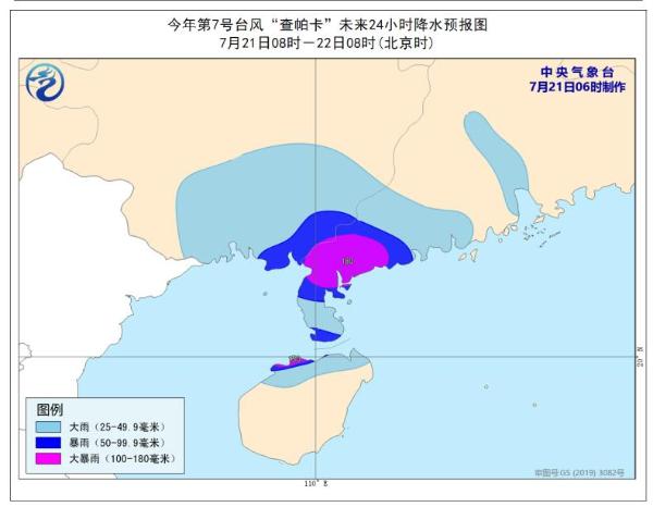 风雨预报:21日8时至22日8时,南海西北部海域、琼州海峡、北部湾东部海域以及广东中西部沿海、广西沿海、海南岛东部沿海将有6~7级大风,南海西北部局地海域风力可达8级,阵风9~10级;广东中西部沿海、广西东南部、海南岛西北部等地的部分地区有暴雨到大暴雨(100~180毫米)。