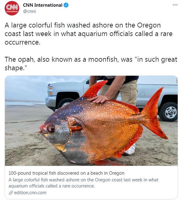 这条鱼名为“月鱼”,也被称为“月亮鱼”,是在该州西北部城市锡赛德的海滩上发现的。锡赛德水族馆在社交网站上表示,这条3.5英尺长的鱼“在俄勒冈海岸很罕见”。