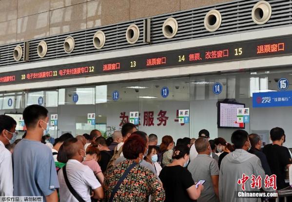 7月21日,石家庄火车站购票大厅,民众排队办理退票。当日,石家庄火车站官方微博发布停运公告信息:受河南多地遭遇持续强降雨天气影响,7月21日、22日,该站多趟列车停运。其中,7月21日停运高铁列车155列,停运普速列车87列。 中新社记者 翟羽佳 摄