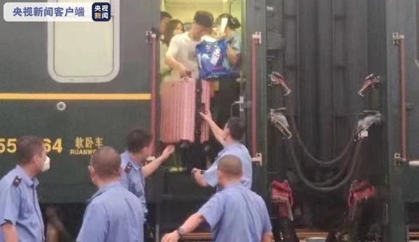 连日来持续强降雨导致河南境内多趟旅客列车长时间滞留,铁路公安民警和铁路工作人员通力合作,维持列车秩序,确保物资供给。