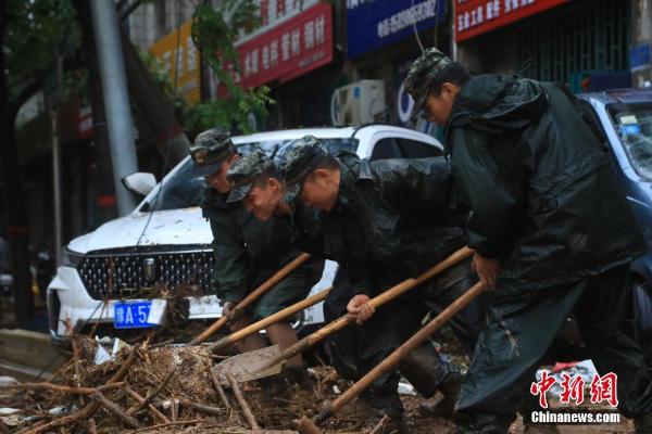 7月21日,武警官兵在河南省巩义市米河镇街道上清理杂物。受连续强降雨影响,河南省巩义市、登封市受灾严重,武警第一机动总队某支队紧急出动400余名兵力赶赴受灾区域展开救援,兵分多路疏通被淹道路,转移受灾民众。 中新社发 蔡霖伟 摄