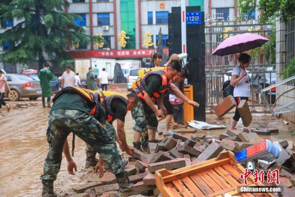 7月21日,武警官兵在河南省巩义市米河镇街道上清理杂物。受连续强降雨影响,河南省巩义市、登封市受灾严重,武警第一机动总队某支队紧急出动400余名兵力赶赴受灾区域展开救援,兵分多路疏通被淹道路,转移受灾民众。 中新社发 蔡霖伟 摄