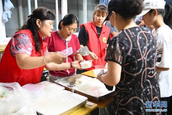 7月21日,在郑州市电子信息工程学校集中安置点,志愿者为转移群众发放晚餐。近日,受强降雨影响,河南省郑州市常庄水库水位持续上升。为保障水库周边居民生命财产安全,郑州市中原区组织人员紧急转移常庄水库周边居民230人。记者在郑州市电子信息工程学校集中安置点看到,转移群众食宿有保障,安置状况良好。 新华社记者 郝源 摄