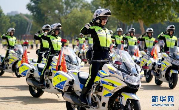 7月25日拍摄的西安市公安局交警支队女子铁骑。当日,由50名女警组成的西安市公安局交通警察支队女子铁骑队伍亮相古城。在出征仪式上,女骑警们进行了站立骑行、绕桩、隐蔽骑行等一系列铁骑表演,尽显巾帼风采。 新华社记者 刘潇 摄