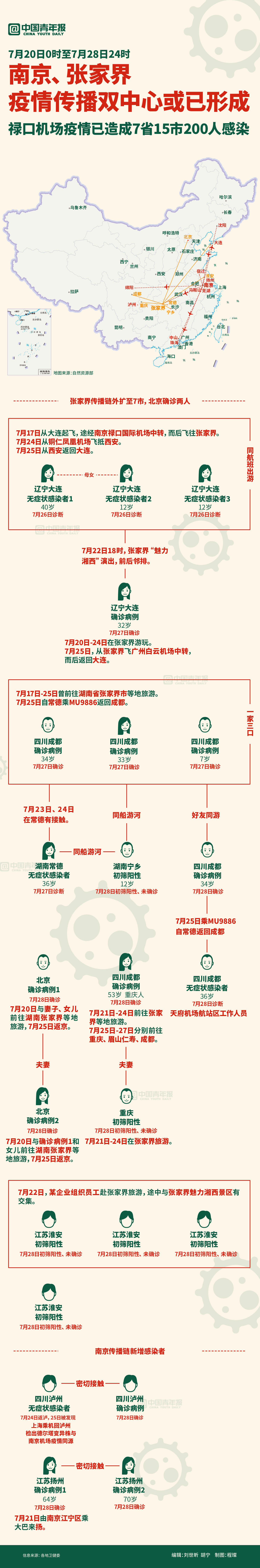 7月20日0时至28日24时,南京禄口机场相关疫情已造成全国7省15市200人感染,其中南京本地感染者173例。南京传播链昨日增扩到扬州。同时,由南京病例外溢到张家界引发的新传播链,目前以张家界为中心,外扩至包括北京、成都在内的7市。北京已确诊两例张家界关联病例。7月28日,成都出现一名在天府机场工作的无症状感染者,他曾于7月25日与成都确诊病例搭乘同一航班返蓉。天府机场是本次疫情中第二个出现员工感染的机场。(图/程璨 文/胡宁)