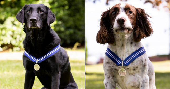 这两只警犬分别是英国猎犬Alfie和拉布拉多犬AJ,它们在英国皇家空军第四警察(Typhoon)中队服役了6年,因在协助寻找武器、弹药和爆炸物中的出色表现而得到了官方的认可。