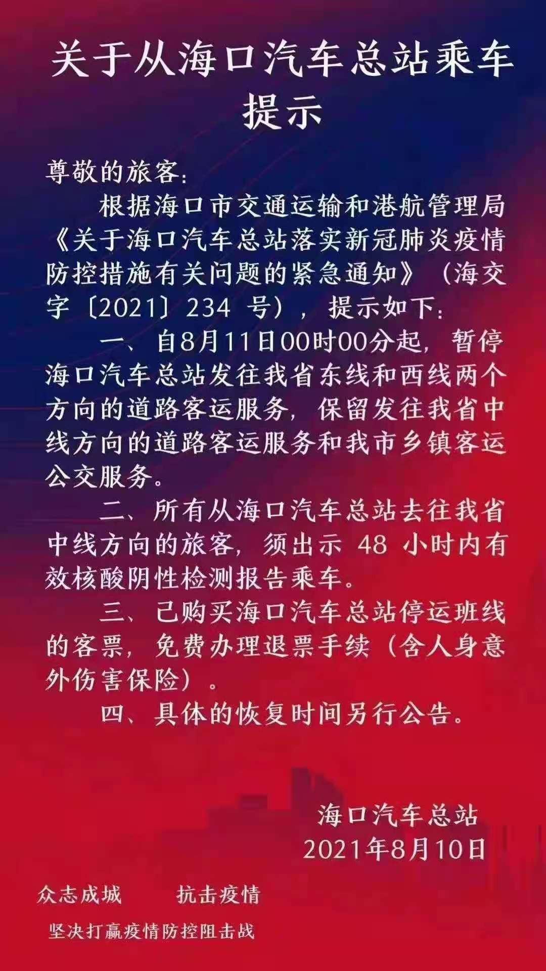 此外,所有从海口汽车总站去往海南省中线方向的旅客,须出示48小时内有效核酸阴性检测报告乘车。提醒已购买海口汽车总站停运班线客票的旅客,可免费办理退票手续(含人身意外伤害保险),具体恢复时间另行公告。