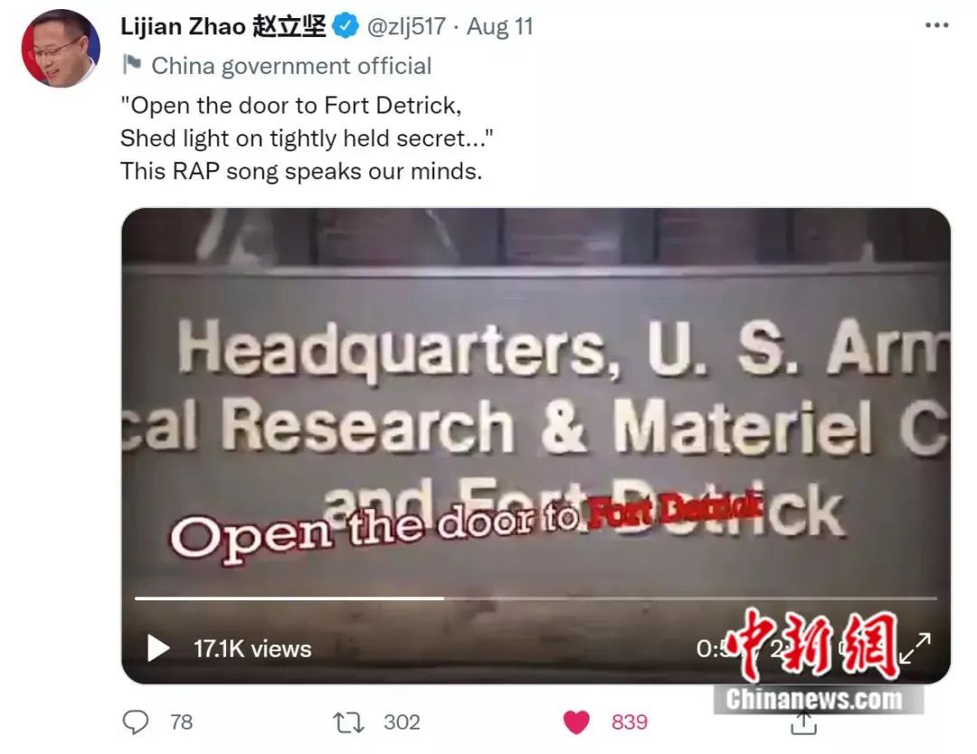 “打开德特里克堡(德堡)的大门!”“背后曾有什么样的魔鬼交易?”“我们需要真相!”……近日,“天府事变”用犀利的歌词向美国喊话,传递出广大中国民众的心声。《说唱:打开德堡的大门》在海外平台发布后,吸引超过500万外国网友围观点赞。中国外交部发言人赵立坚也在推特上转发,并评论道:“这首歌曲唱出了我们的心声。”
