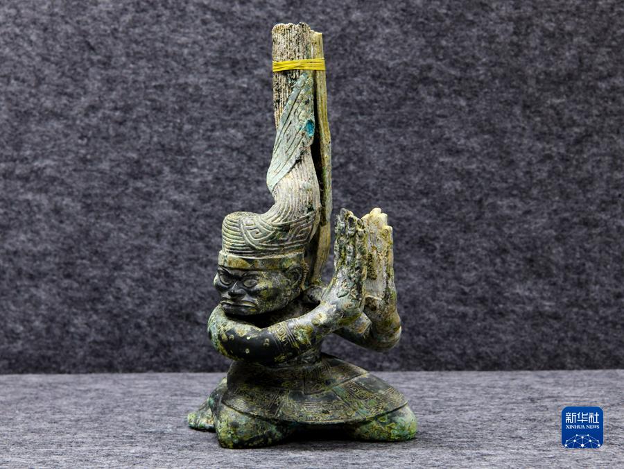 这是在四川省文物考古研究院三星堆考古研究所拍摄的三星堆遗址4号“祭祀坑”出土的铜扭头跪坐人像(9月3日摄)。新华社记者 王曦 摄