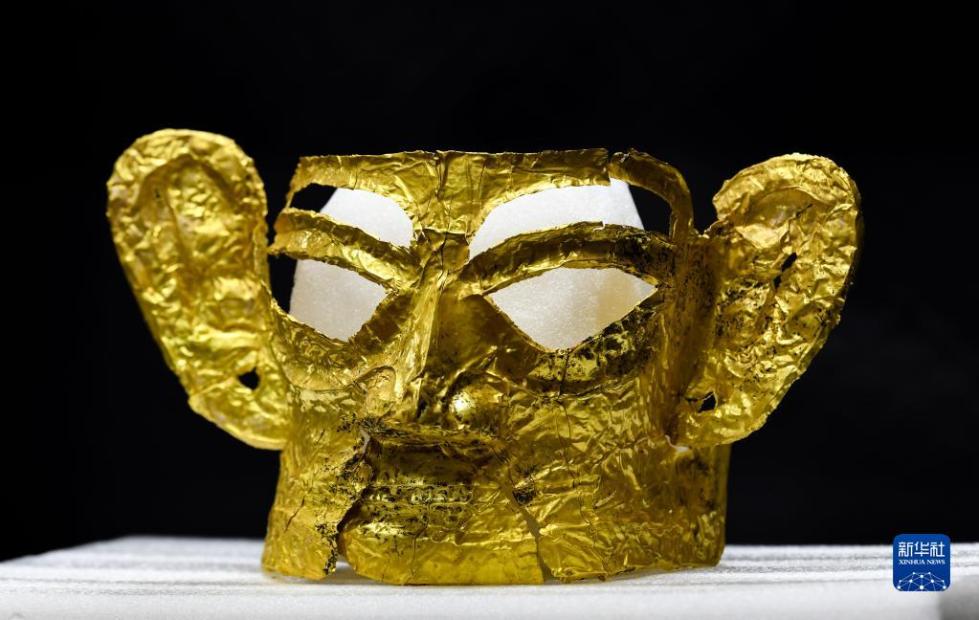 这是在四川省文物考古研究院三星堆考古研究所拍摄的三星堆遗址3号“祭祀坑”出土的金面具(9月2日摄)。新华社记者 王曦 摄