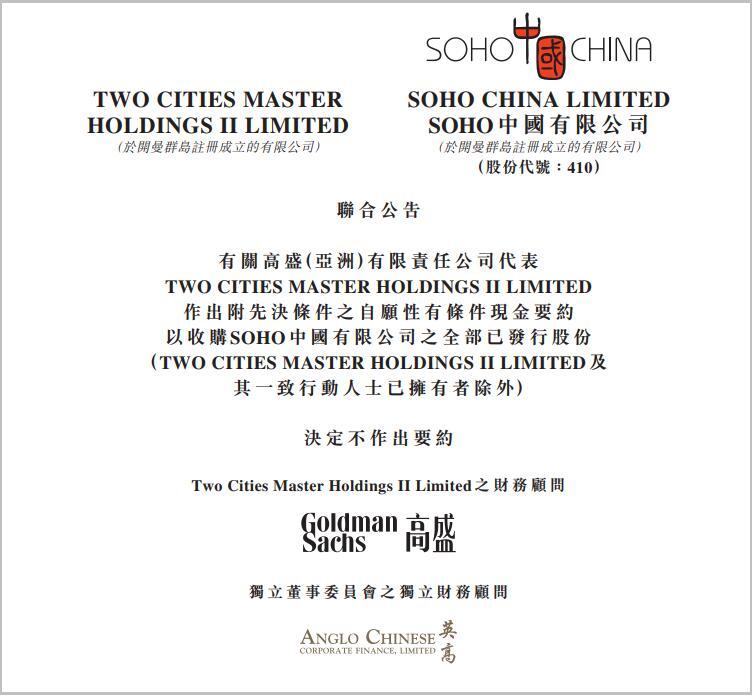 据港交所消息,9月10日,SOHO中国发布公告,就此前高盛代表黑石集团(BX.N)收购公司全部已发行股份的要约表示,鉴于目前满足先决条件的进展不足,各方共同评估了满足先决条件所需的正在进行中的评估程序,以及在要约时间表内完成该程序的可能性后,一致认为无法在最后截止日当天或之前满足先决条件,也一致同意不会推迟最后截止日。