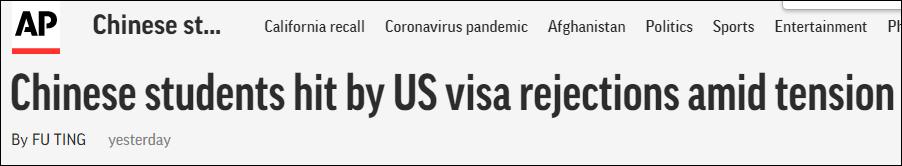美联社9月14日以“中国学生在美中关系紧张中被美国拒签”为题刊文,采访了多名被美国拒签的中国留学生和家属。