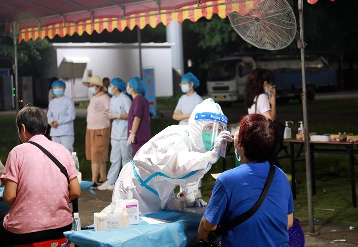 2021年6月7日晚,广东中山东区桃苑社区核酸检测点,志愿者们和医务人员们一起坚守“抗疫”一线。图片来源:人民视觉