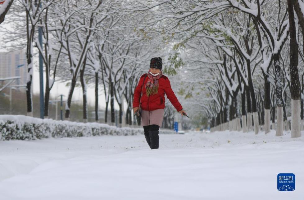 11月9日,沈阳市民踏雪出行。