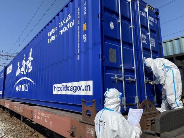 霍尔果斯海关关员现场验核中欧班列集装箱封志 孙婉娇 摄