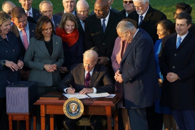 11月15日,美国总统拜登(中)在华盛顿白宫出席基础设施投资法案签字仪式。新华社发(沈霆摄)