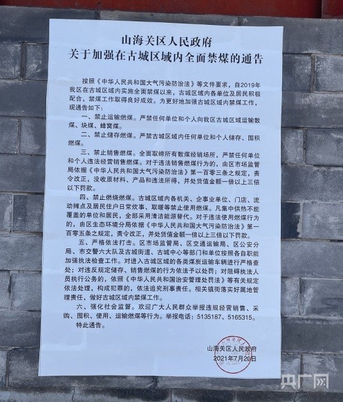 △山海关古城区域加强全面禁煤的政府通告(总台央广记者 管昕 摄)