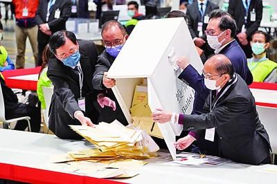 12月19日,香港特区选举管理委员会主席冯骅(右二)打开票箱。新华社发